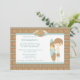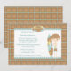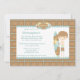 Este convite para festas de aniversário 5x7 tem um fundo de xadrez azul e marrom. Há um rapaz de maiô segurando um prato de surfe, ao lado da informação personalizável da parte. Estúdio de Cacau