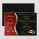 Um convite de festa de aniversário de casamento de 50 anos preto, vermelho e dourado. Taças de champanhe tilintando e alianças de casamento unidas, decoram este cartão de festa.