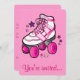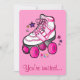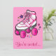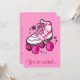 Este convite para uma festa de aniversário de patinação apresenta um skate cor-de-rosa decorativo.