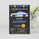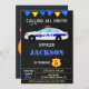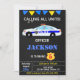 Concurso de aniversário para polícia convite para crachá de polícia. Convide seus amigos para a festa de policiais e ladrões com este brilhante e colorido convite da polícia! Este convite para o tema de carro da polícia preto e azul mostra carro da polícia, crachá do xerife da polícia e uma garland no topo. Simplesmente edite este menu de personalização fácil de usar modelo para torná-lo especial.