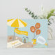 Um convite de aniversário de praia divertido, ousado e ilustrado que integra inteligentemente texto em balões, toalhas de praia, bandeiras e bolhas para separá-lo dos convites tradicionais.
