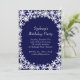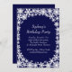 Flocos de neve brancos brilhantes em uma decoração de fundo azul profunda neste Convite de aniversário de inverno. Este convite é fácil de personalizar com qualquer nome e perfeito para qualquer idade. Se forem necessários itens adicionais nesta coleção, entre em contato conosco em prettyfancyinvites@gmail.com com sua solicitação.