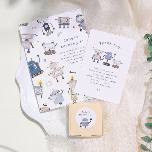 Um convite de aniversário de robôs fofo. Com robôs e ferramentas bonitos desenhados à mão, este convite é perfeito para qualquer criança que ame ciência, tecnologia e todas as coisas robóticas. Excelente para festas de robôs, ciência, tecnologia ou temática STEM. Sinta-se à vontade para me enviar uma mensagem se você quiser este convite em um esquema de cores diferente! Como parte da seleção do orçamento do Zazzle, esta folha não vem em tamanhos padrão de cartão. Para colocar este design em uma placa padrão, você pode encontrá-lo na coleção ou usar o Zazzle Make Machine para transferi-lo para o seu produto preferido. Visualize a coleção vinculada nesta página ou visite nossa loja para mais convites de festas de aniversários.