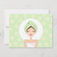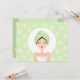 Convite de festa de spa para meninas e mulheres com uma bela mulher com uma toalha na cabeça deitada de olhos fechados. Ao seu redor estão flores de frangipani / plumeria