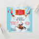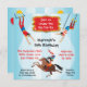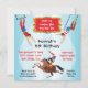 Artistas de trapézio voadores e uma garota acrobata fazem uma banca em um cavalo galopante debaixo do topo. Este convite de aniversário de circo mostra o nome da pessoa de aniversário. Ilustração desenhada à mão por McBooboo.