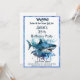 Um convite de aniversário de tubarões. Personalize com suas informações.
