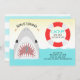 O convite de aniversário temático do tubarão divertido, com um legal tubarão ilustrado, tirando um golpe da idade da criança de aniversário. Também com um salva-vidas de piscinas brancas e vermelhas bonitinho. Perfeito para uma festa de piscina ou festa de aniversário de verão!