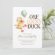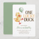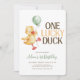 Convite de 1º Aniversário Um Pato Sortudo Celebre o dia especial do seu pequeno com este adorável convite de 1º aniversário temático "Um Pato Sortudo"! Com um charmoso pato em aquarela segurando um balão e tipografia elegante, este design é perfeito para uma celebração divertida e emocionante.