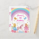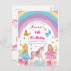 Este é um convite de aniversário temático de unicórnio e arco-íris para crianças. O design inclui decoração de arco-íris e brilho com estrelas, arco-íris e flores.