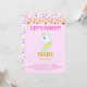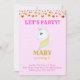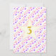 Convite de Aniversário de Unicórnio Fofo. Cabeçalho encantador com bolinhas douradas, unicórnio com arco-íris de três cores e padrão de estrelas em fundo rosa. O verso tem bolinhas multicoloridas e o número 3 dentro de uma estrela. Todos os textos e números podem ser personalizados.