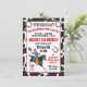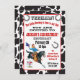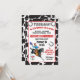 Que fofo! Vintage pequeno cowboy cavalgando seu garanhão preto e pulando sobre uma cerca com espaço para colocar sua idade em um fundo de vaca. Ferraduras, banner e tipografia divertida tornam este convite de aniversário ocidental estilo poster perfeito para o seu pequeno balde!