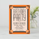 Um convite de aniversário ousado para enviar aos amigos e à família. Este Convite de aniversário de Deco de Arte Laranja pode ser personalizado com o nome e os detalhes da festa. Um padrão de deco de arte geométrica em três tons de linhas laranja e pretas.