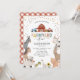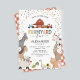 Convites de aniversário infantis da fazenda fofos com um fundo branco simples, animais da fazenda adoráveis, incluindo uma vaca, cabra, porco, ovelha, burro, cavalo, coelho, pato e um galo, e um modelo de celebração de aniversário infantil fácil de personalizar.