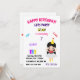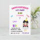Convite de aniversário de menina com nome e idade personalizados celebrando diversão, jogos, bolo e sorvete.