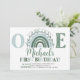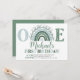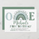 Um divertido convite para o primeiro aniversário do arco-íris com tons verdes que é perfeito para uma festa temática do arco-íris para o seu primeiro aniversário!