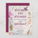 Uma bruxa e um mágico magia, o Convite de aniversário infantil. Em um fundo de rolagem matizado de cinza, objetos temáticos mágicos incluindo um chapéu, coruja, rolagem, vassoura, caldeirão e dragão cercam o texto decorativo roxo que lê Bruxas e Assistentes, por favor junte-se a nós para o Seu Nome Seu Aniversário. Personalize adicionando seu evento de cheio e os detalhes de contato.