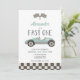 Convite para primeiro aniversario de Carro Rápido de Uma Corrida com carro de corrida azul.