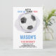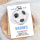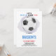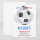 Comemoração digna de gol com este convite de aniversário de futebol de bola de centro! Apresentando uma bola de futebol clássica preto-e-branco colocada no centro do campo em um fundo verde vibrante, este design editável é perfeito para jovens atletas e fãs de futebol. Personalize facilmente o nome, a idade, a data e os detalhes da festa do seu filho usando as ferramentas amigáveis do Zazzle. Ideal para aniversários temáticos de futebol, eventos de equipes ou festas esportivas.