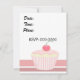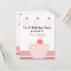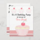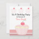 Um doce convite de aniversário com uma fila de cupcakes no topo. Um grande cupcake com um revestimento rosado e glacé rosa pontiagudo com uma cereja acentua o fundo. As listras cor-de-rosa também destacam o fundo. Personalize com todas as informações de aniversário conforme desejado.