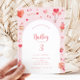 Convite de festa de aniversário com tema do Dia dos Namorados. Perfeito para o seu pequeno querido completar 1, 2, 3, 4, 5, 6, 7 etc! Este convite de aniversário do Dia dos Namorados tem um design de arco e todo o texto pode ser personalizado com as palavras e fontes de sua escolha. O design apresenta tudo relacionado ao Dia dos Namorados, como corações, xoxo, sorvete, cupcakes, flores e flechas do Cupido em tons de vermelho e rosa.