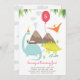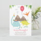 Um convite de aniversário para miúdos, caracterizando um dinossauro e um balão.