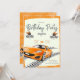 Carro de Corrida Pneu Convocação de Aniversário do Rapaz do Empregador. Este é um convite de aniversário para uma festa de menino com um tema de carro de corrida e bandeiras de corrida. O design apresenta uma ilustração do plano de fundo da pista do pneu. O texto convida convidados a comemorar o dia especial do aniversariante e promete um evento divertido com atividades e jogos inspirados em corridas. Perfeito para um pequeno entusiasta do carro, este convite é para que todos fiquem animados com a festa. O fundo é o padrão de corrida de carros.