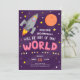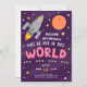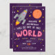 Celebre seu aniversário em estilo com este convite de aniversário com tema espacial! Com uma cinza e um foguete cor-de-rosa rodeados de estrelas e a lua no espaço roxo, é fácil personalizar os detalhes com informações para a festa do seu próprio astronauta. Adicione a sua foto ao dentro de trás, um espaço para um verdadeiro convite deste mundo!