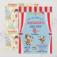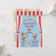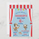 O circo temia qualquer convite de aniversário, convite perfeito para convidar seus convidados para sua grande festa de aniversário. A frente apresenta uma grande tenda superior com faixa de montagem, mestre de anéis, elefante e bandeira de circo. A parte de trás do convite tem impressão de circo, elefante, palhaço e selo de atuação. Edite todo o texto você mesmo quando solicitar.