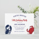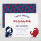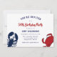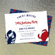 Convites de festa de aniversário de lagostas e caranguejos para ele em vermelho, branco e azul. Personalize para qualquer tipo de festa relacionada ao mar com texto azul-marinho sobre branco. O título/tipo da festa está em vermelho escuro. Um design de lagosta azul e caranguejo vermelho na frente com um padrão de crustáceos no verso.