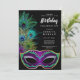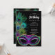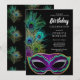 Este convite deslumbrante inclui penas de pavão cintilantes com uma máscara festiva do Mardi Gras.