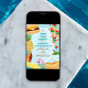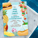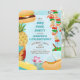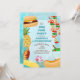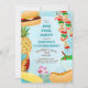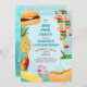 convite de aniversário da Festa de Piscina de churrasco com comida de churrasco saborosa num fundo de água de piscina de natação. O design tem um hambúrguer, cachorro-quente, galinha, kebab, milho no berço, tigela de salada, abacaxi e uma bebida. A Festa de Piscina de churrasco (editável) está escrita em tipografia retrógrada e o modelo de convite está pronto para você personalizar com seus detalhes. Uma design de verão divertida - ideal para a festa de churrasco de quintal, churrasco familiar anual ou festa de aniversário para crianças ou adultos.