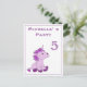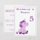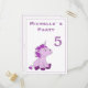 Um cartão postal de unicórnio para celebração de festa de aniversário infantil. Um cartão de convite de aniversário personalizável. Todos os dados são escritos no verso do cartão postal. Este convite tem um pequeno e fofo unicórnio rosa e roxo sentado e olhando para o número da idade. O unicórnio rosa torna isso ótimo como um convite de festa para o aniversário de uma menina e suas amigas.