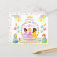 Um tema da princesa, Convite de aniversário infantil. Em fundo branco, princesas em vestidos azuis, roxos, cor-de-rosa, amarelos e verdes são vistas ao redor de um pódio com flores, balões, bolo e presentes. O texto da tipografia diz o nome da sua criança, a festa princesa, com uma coroa decorativa no topo. A idade da criança é escrita em duas nuvens flanqueadas por arco-íris. Personalize adicionando seu evento de cheio e os detalhes de contato.