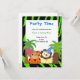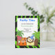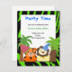 O mais bonito tigre e leão vestindo chapéus coloridos acenam este convite de aniversário da selva divertida. Palmeiras soprando ao fundo. Uma fronteira de impressão de pelo de tigre. Personalize com todas as suas informações pessoais conforme desejado. Um convite para zoológico divertido.