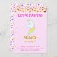 Convite de Aniversário do Unicórn. Cabeçalho de bolinhas adorável, unicórnio com três cores arco-íris e padrão estelar em fundo rosa. O verso tem bolinhas de cores múltiplas e dentro a estrela número 3. Todos os textos e números podem ser personalizados.