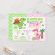 Celebre dois pequenos fãs de dinossauros com este adorável Convite de Aniversário Conjunto de Dinossauro para Menino e Menina, criado especialmente para uma festa de aniversário compartilhada para irmãos ou melhores amigos. Este design divertido apresenta um dinossauro verde fofo para o menino aniversariante e um dinossauro de tutu rosa doce para a menina aniversariante, cercado por elementos tropicais brilhantes e detalhes divertidos.