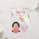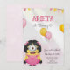 Convite de aniversário para o sexto aniversário de uma criança com um personagem de desenho animado fofo vestido de rosa, com balões coloridos e texto comemorativo.