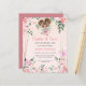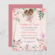Convite de festa de aniversário de fada personalizável e acessível em papel, apresentando uma fada fofa com ramos e uma bela borda de flores, em tons de rosa suave, pêssego, rosa poeira com uma borda geométrica dourada e borboletas.