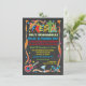 Convite de festas Fiesta Mexicano Chalkboard. Santo guacamole! Possui guitarra, maracas, margarita e um quadro divertido com confetti. A palavra "fiesta" é desenhada com elementos mexicanos. Ilustração desenhada à mão por McBooboos. Excelente para uma festa de aniversário ou qualquer ocasião especial.