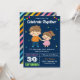 Incêndios para seus convidados com esta festa de aniversário gêmea convidando com um garoto fofo e uma garota com tipografia moderna contra um fundo azul. Basta adicionar os detalhes do seu evento neste modelo fácil de usar para torná-lo um convite de tipo único. Sacudir a placa para revelar um padrão colorido de listras na parte traseira da placa.