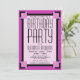 Um convite de aniversário ousado para enviar aos amigos e à família. Este Convite de aniversário Geométrico de Deco de Arte Púrpura pode ser personalizado com o nome e os detalhes da festa. Um padrão de deco de arte geométrica em três tons de linhas roxas e pretas.