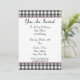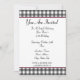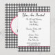 Um convite simples com um design gingham cinza carvão na parte superior e inferior da frente. Corte rosa e fonte em negrito de fita preta. Personalize com detalhes da sua ocasião. O lado oposto apresenta um design sólido com uma forma circular no meio, enquadrando o texto.
