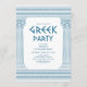 Convite de festa de aniversário com Toga grega ou romana elegante com pilares de templo elegantes e padrão de meandro grego em azul. Produto personalizável para uma celebração memorável. Perfeito para casamentos, noivados, festas de formatura, aniversários, save the dates, despedida de solteira e festas de aniversário.