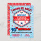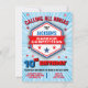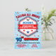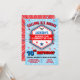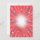 convite de aniversário Ninja Warrior estilo poster com blindagem, estrelas, fundo de explosão solar e cores vermelha, branca e azul.