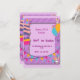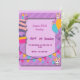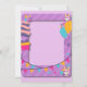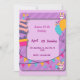 um cartão vibrante com tema roxo apresentando ilustrações festivas de um bolo de andares, balões.