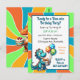 Convites de Aniversário Personalizados Adoráveis para Meninos. Tema de dinossauro fofo em azul, laranja e verde. Dinossauros de desenho animado fofos segurando balões e bolo de aniversário.