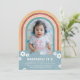 Convide amigos e familiares para a festa de aniversário do seu filho com este convite de festa simples, mas adorável com tema retrô. O cartão apresenta uma foto da criança enquadrada por um desenho colorido de arco-íris. Os detalhes do evento são colocados sobre um simples desenho de nuvem e cercados por algumas margaridas. A parte de trás do cartão apresenta um padrão de listras diagonais em cores coordenadas. Este convite também seria perfeito para um chá de bebê!