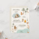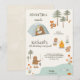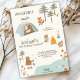 Convite de aniversário infantil com tema de camping. Apresenta animais como uma raposa e um urso, barraca e fogueira. O texto diz “A aventura espera” e fornece detalhes do evento.