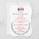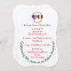 Convite de aniversário por um italiano americano. Bandeiras em forma de coração da Itália e dos EUA estão cercadas pelas palavras MEU PAÍS MEU PATRIMÔNIO. O texto circular diz CELEBRAR 50 ANOS COMO UM ITALIANO-AMERICANO. Você pode mudar isso para qualquer texto que quiser. Locais para adicionar o nome da pessoa de aniversário, a data da festa, a localização e as informações de contato ao RSVP.