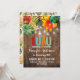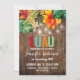 A design de festa de aniversário de Luau apresenta um fundo de madeira rústica, flores tropicais, abacaxi, luzes de jarro de pedras e correspondências atrás. Para acessar ferramentas avançadas de edição, vá para o link "Personalizar" e, em seguida, "clicar para personalizar mais".